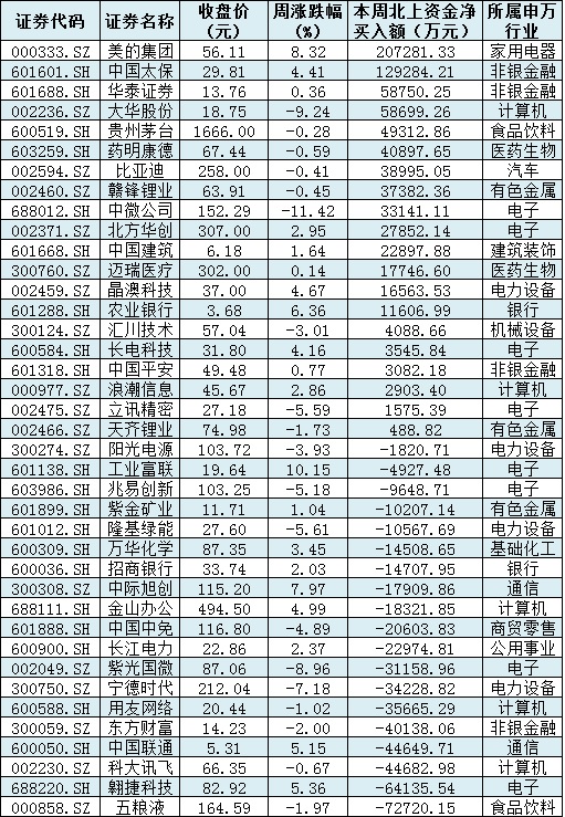 資金方面,本周北向資金累計(jì)凈買入金額達(dá)17.29億元。從前十大成交活躍股來看,本周,美的集團(tuán)、中國(guó)太保等2只個(gè)股,北向資金凈買入金額均超10億元。另外,五糧液、翱捷科技等個(gè)股遭北向資金凈賣出金額均超6億元。