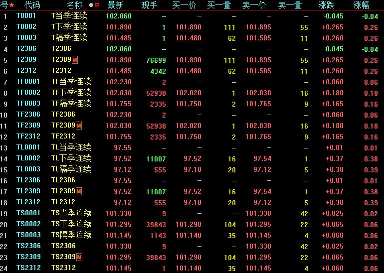 周五,國(guó)債期貨全線收漲,30年期主力合約漲0.38%,10年期主力合約漲0.26%,5年期主力合約漲0.18%,2年期主力合約漲0.06%。