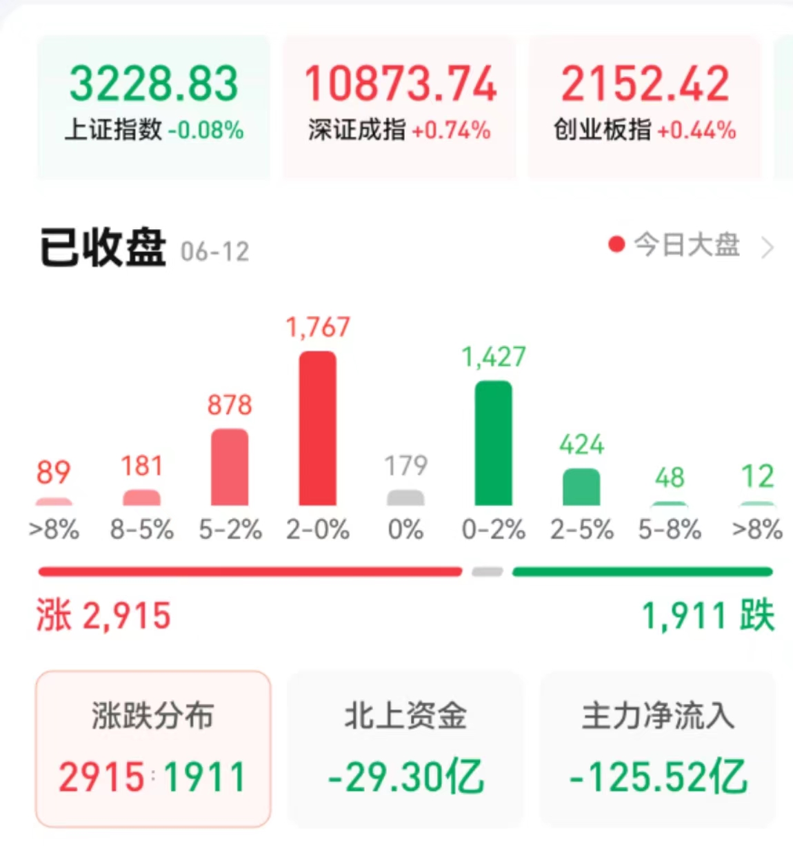 周一(6月12日),A股三大股指震蕩分化,漲跌不一。截至收盤,上證指數(shù)跌0.08%報3228.83點(diǎn),深證成指漲0.74%報10873.74點(diǎn),創(chuàng)業(yè)板指漲0.44%報2152.42點(diǎn);兩市合計成交9654億元,北向資金凈賣出29.3億元??傮w上看,兩市個股漲多跌少。其中,漲停個股達(dá)71只,跌停個股達(dá)13只。