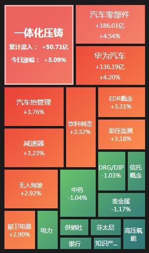 具體熱點(diǎn)板塊方面,今日,一體化壓鑄板塊領(lǐng)漲,文燦股份等6只概念股漲停;汽車零部件板塊集體走強(qiáng),躍嶺股份等20只個股漲停,資金凈流入達(dá)186.01億元;華為汽車、汽車熱管理、EDR概念、減速器、無人駕駛等板塊表現(xiàn)活躍。高壓氧艙板塊領(lǐng)跌,知識產(chǎn)權(quán)保護(hù)、銀行、貴金屬、電力、供銷社、中藥等板塊跌幅居前。