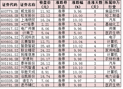 表:連續(xù)上漲3日且今日收盤漲停個股情況: