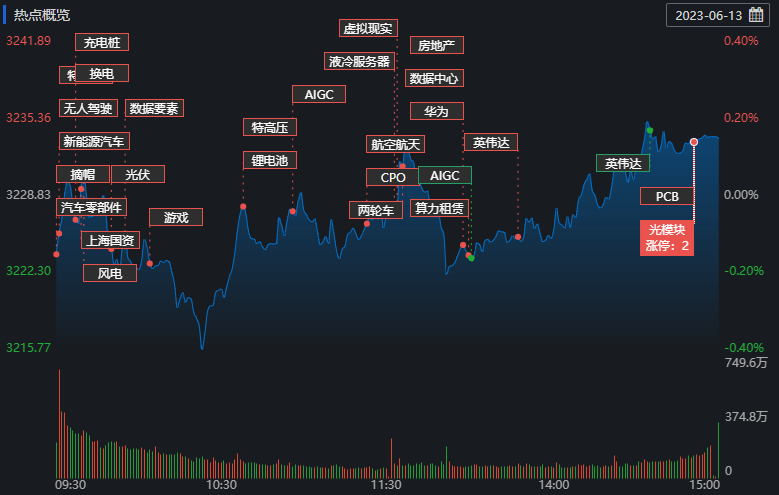 6月13日,A股三大指數(shù)震蕩上漲,呈深強滬弱格局,深證成指略低開后快速翻紅,之后基本保持在紅盤以上。K線形態(tài)上,深證成指已走出4連陽,技術(shù)上已出現(xiàn)強勢信號。截至收盤,上證指數(shù)漲0.15%報3233.67點;深證成指漲0.76%報10955.96點,創(chuàng)業(yè)板指漲0.68%報2166.96點,A股合計成交額9434.61億元,較前一交易日縮減2.39%,已連續(xù)3天超9000億元;北向資金全天凈買入-2.31億元;其中滬股通凈買入-3.53億元,深股通凈買入1.22億元。今日A股漲多跌少,有2671只上漲,2262只下跌。