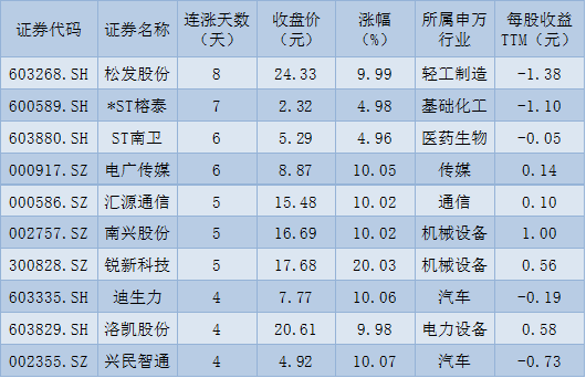 表:連續(xù)上漲4日且今日收盤漲停股一覽