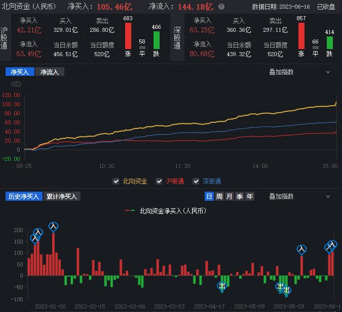 6月16日,A股三大指數(shù)早盤震蕩走高,下午出現(xiàn)快速拉升過程,繼續(xù)呈現(xiàn)深強格局,創(chuàng)業(yè)板指漲1.44%,深證成指走出7連陽。截至收盤,上證指數(shù)漲0.63%報3273.33點;深證成指漲1.11%報11306.53點,創(chuàng)業(yè)板指漲1.44%報2270.06點。A股合計成交額10688.37億元,較前一交易日縮減0.45%,這是本輪A股連續(xù)第三個交易日成交額站上1萬億元。北向資金全天凈買入105.46億元,創(chuàng)今年2月10日以來新高,其中滬股通凈買入42.21億元,深股通凈買入63.25億元。今日A股漲多跌少,有3094只上漲,1831只下跌。