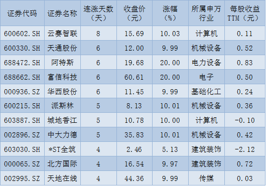表:連續(xù)上漲4日且今日收盤漲停股一覽