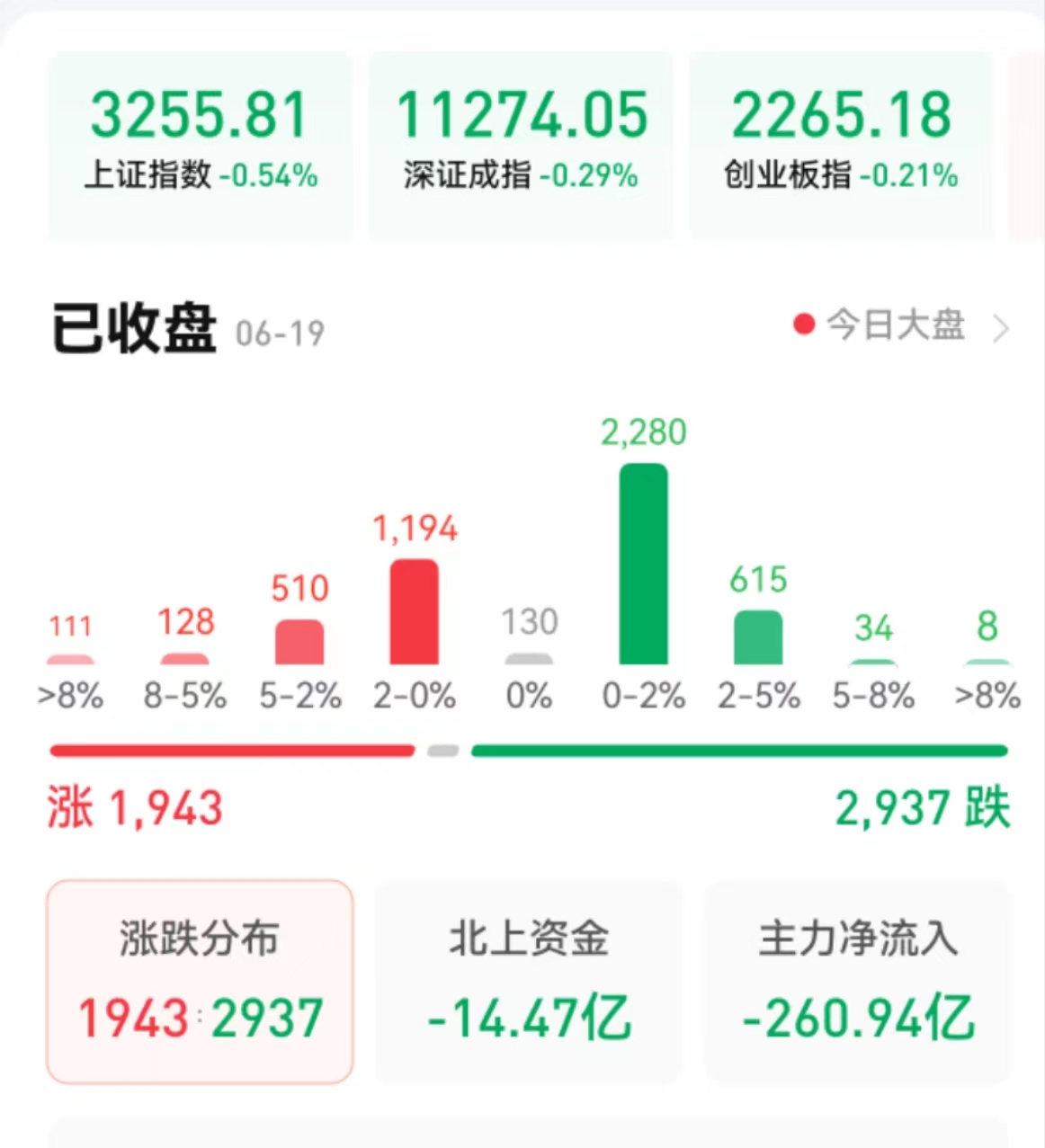 周一(6月19日),A股三大股指震蕩回落。截至收盤,上證指數(shù)跌0.54%報(bào)3255.81點(diǎn),深證成指跌0.29%報(bào)11274.05點(diǎn),創(chuàng)業(yè)板指跌0.21%報(bào)2265.18點(diǎn),兩市合計(jì)成交金額達(dá)11067億元,連續(xù)第4個(gè)交易日突破萬億元;北向資金凈賣出14.47億元。總體上看,兩市個(gè)股跌多漲少。其中,漲停個(gè)股達(dá)54只,跌停個(gè)股達(dá)6只。