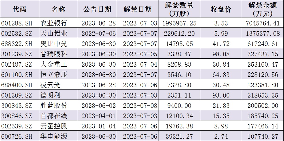與此同時,據(jù)同花順統(tǒng)計顯示,下周(7月3日-7日)共有88家公司限售股陸續(xù)解禁,按最新收盤價計算,解禁市值為1226.34億元。從解禁市值來看,農(nóng)業(yè)銀行(704.58億元)、天山鋁業(yè)(137.54億元)等公司解禁金額超100億元。