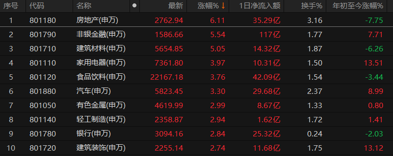 7月25日,行業(yè)漲多跌少。從31個(gè)申萬一級(jí)行業(yè)看,有29個(gè)上漲,占比93.55%,房地產(chǎn)行業(yè)漲幅居首,達(dá)6.11%,大單資金凈流入35.29億元。下跌方面,僅公用事業(yè)和農(nóng)林牧漁小幅回落,跌幅分別為0.40%和0.33%。