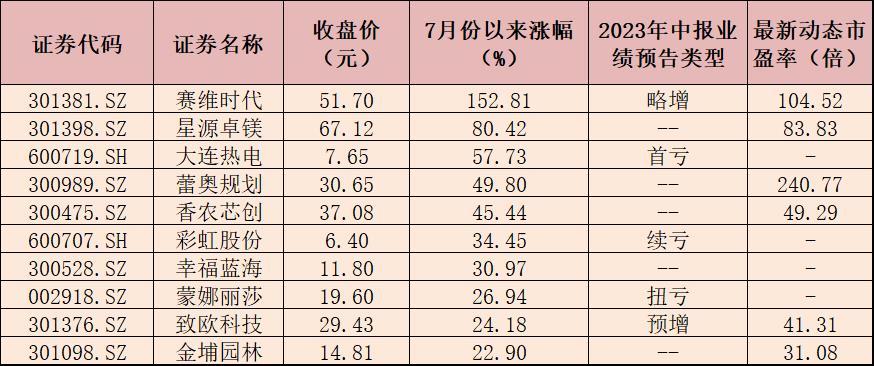 市場表現(xiàn)方面,7月份以來,截至7月26日收盤,上述543只個股中有259只個股期間實現(xiàn)上漲,占比近五成,其中,賽維時代、星源卓鎂、大連熱電等3只個股期間累計漲幅居前三,均漲超57%。