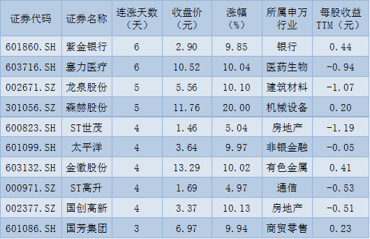 表:連續(xù)上漲3日且今日收盤漲停股一覽