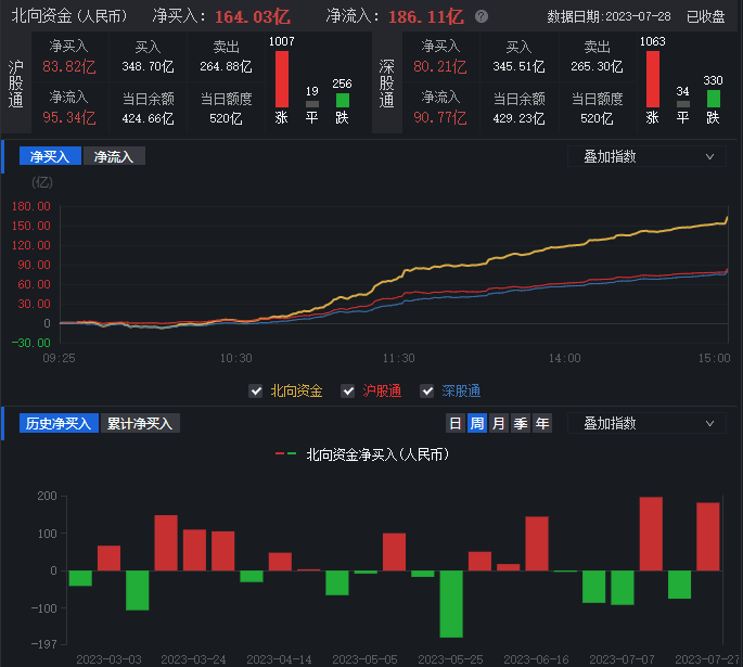 7月28日,A股三大指數(shù)低開高走。個股漲多跌少,量能明顯放大,北向資金凈買入逾160億元。周線來看,滬指形成放量長陽,收盤一舉站上近9周的最高點。有機構分析人士表示,從本周的情況看,以上證50為代表的績優(yōu)藍籌股走勢領先,成為市場走強的先發(fā)信號,真正的大行情往往需多主線輪動共振所構成。