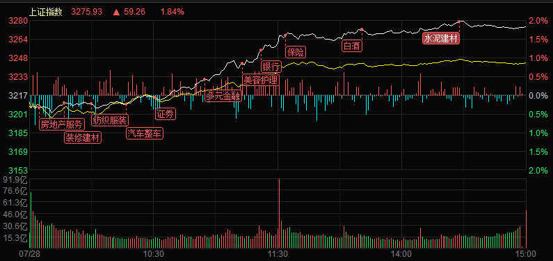 7月28日,A股三大指數(shù)低開,10:38左右滬指翻紅,隨后不斷上揚,證券板塊領漲,滬指最高沖至3280.28點。截至收盤,上證指數(shù)漲1.84%報3275.93點;深證成指漲1.62%報11100.40點,創(chuàng)業(yè)板指漲1.62%報2219.54點。A股合計成交額9494.41億元,較前一交易日增長21.57%;北向資金全天凈買入164.03億元;其中滬股通凈買入83.82億元,深股通凈買入80.21億元。今日A股有3644只個股上漲,1437只下跌,漲跌比為2.54。