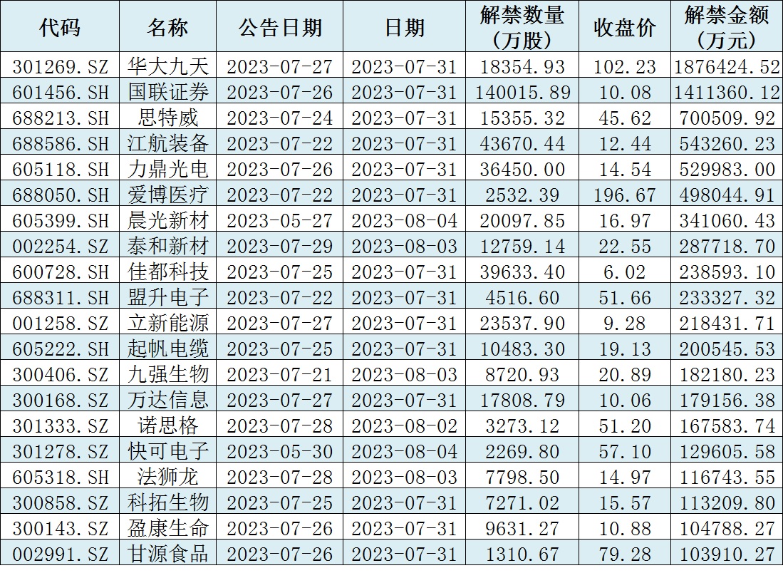 與此同時(shí),據(jù)同花順統(tǒng)計(jì)顯示,下周(7月31日-8月4日)共有53家公司限售股陸續(xù)解禁,按最新收盤價(jià)計(jì)算,解禁市值為881.34億元。從解禁市值來看,華大九天(187.64億元)、國聯(lián)證券(141.14億元)等公司解禁金額均超140億元。