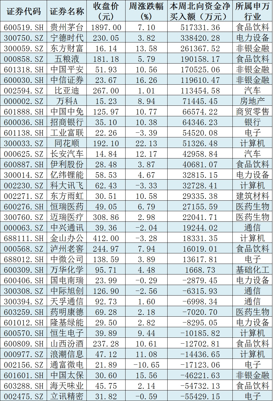 資金方面,本周北向資金累計(jì)凈買入金額達(dá)345.06億元,為今年2月以來最高值,其中,滬股通凈流入201.64億元,深股通凈流入143.42億元。從前十大成交活躍股來看,本周,貴州茅臺、寧德時(shí)代、東方財(cái)富、五糧液、中國平安、中信證券、比亞迪等7只個(gè)股,北向資金凈買入金額均超10億元。另外,立訊精密、海天味業(yè)等個(gè)股遭北向資金凈賣出金額均超5億元。