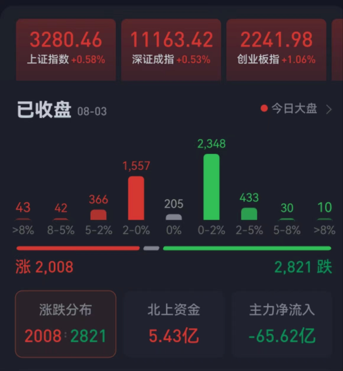 周四(8月3日),A股三大股指震蕩上行,全線飄紅。截至收盤,上證指數(shù)漲0.58%報3280.46點,深證成指漲0.53%報11163.42點,創(chuàng)業(yè)板指漲1.06%報2241.98點;兩市合計成交8328.76億元,北向資金凈買入5.43億元??傮w上看,兩市個股跌多漲少。其中,漲停個股達27只,跌停個股達6只。