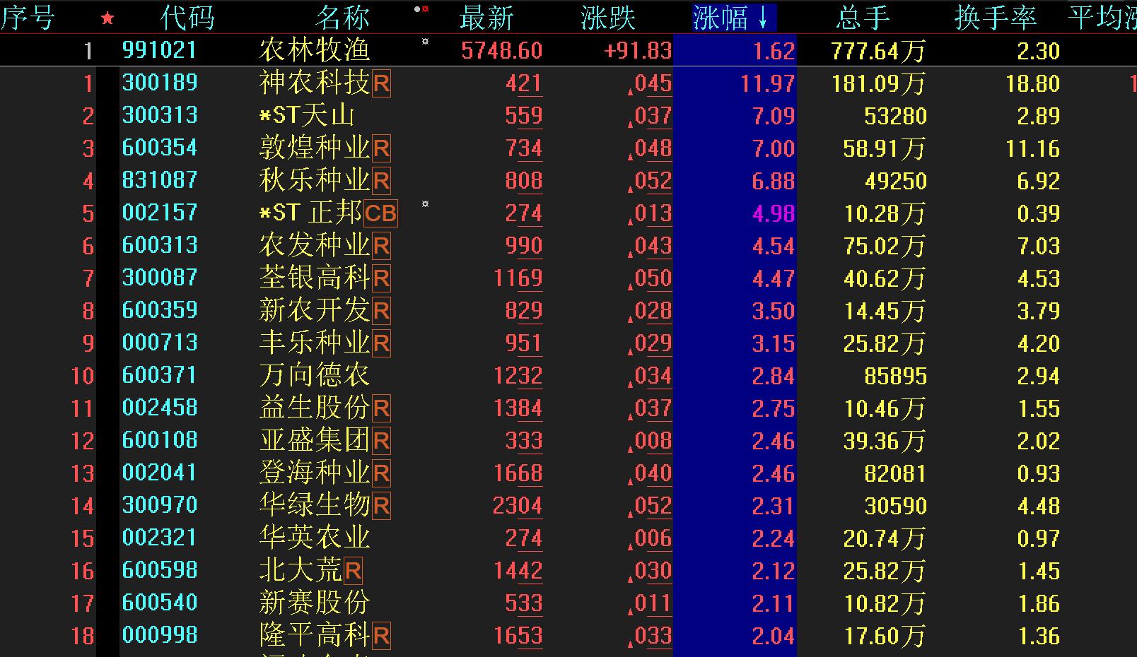 具體看,截至8月7日上午收盤,農(nóng)林牧漁板塊表現(xiàn)搶眼,漲幅達(dá)1.62%。其中,神農(nóng)科技漲幅超10%。
