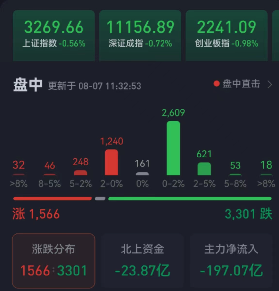 周一(8月7日),三大股指震蕩回落,全線飄綠。截至上午收盤,上證指數(shù)跌0.56%,報(bào)3269.66點(diǎn);深證成指和創(chuàng)業(yè)板指分別跌0.72%和0.98%;滬深兩市合計(jì)成交額5766.5億元,總體來(lái)看,兩市個(gè)股跌多漲少。超3300只個(gè)股出現(xiàn)下跌,其中,漲停個(gè)股達(dá)23只,跌停4只。