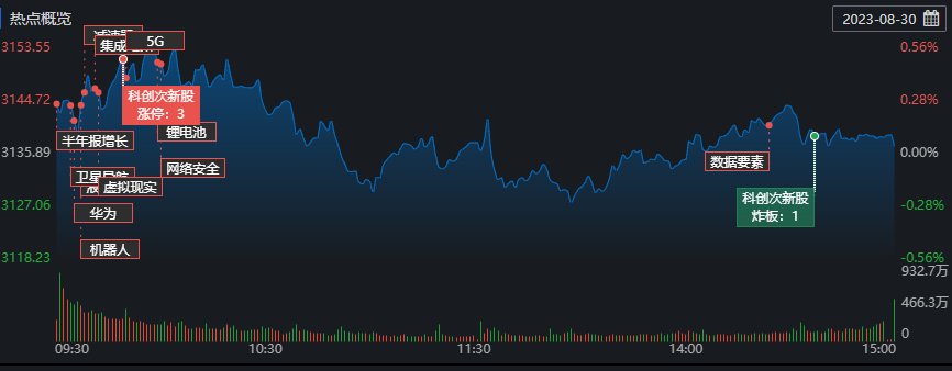 周三(8月30日),A股三大指數(shù)沖高回落,截至收盤,上證指數(shù)漲0.04%,報(bào)3137.14點(diǎn);深證成指漲0.26%,報(bào)10482.50點(diǎn);創(chuàng)業(yè)板指跌0.05%,報(bào)2117.13點(diǎn)。滬深兩市合計(jì)成交額9843.49億元;北向資金凈賣出24.63億元。總體來看,A股個(gè)股漲多跌少,超3000只個(gè)股實(shí)現(xiàn)上漲,其中有48只個(gè)股以漲停價(jià)報(bào)收。