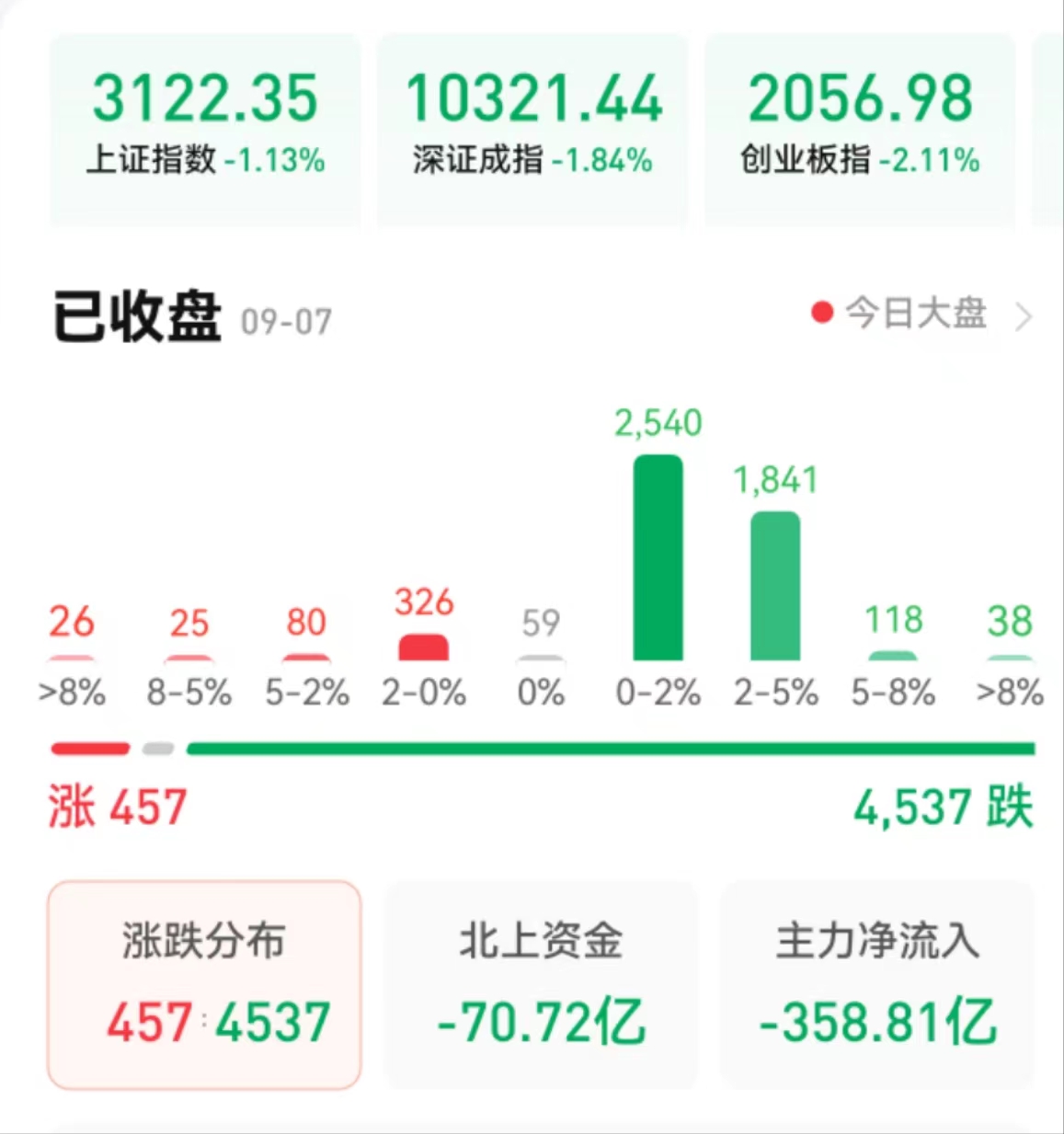 周四(9月7日),A股三大股指震蕩下行,全線飄綠。截至收盤,上證指數(shù)跌1.13%報(bào)3122.35點(diǎn),深成指跌1.84%報(bào)10321.44點(diǎn),創(chuàng)業(yè)板指跌2.11%報(bào)2056.98點(diǎn);兩市合計(jì)成交7668.35億元,北向資金凈賣出70.72億元??傮w上看,兩市個(gè)股跌多漲少,超4500只個(gè)股下跌,上漲個(gè)股不到500只。其中,漲停個(gè)股達(dá)23只,跌停個(gè)股達(dá)4只。