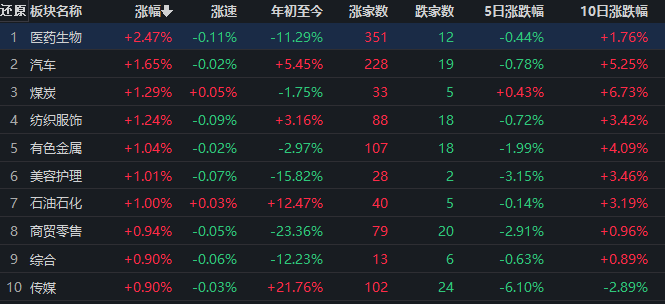 熱點方面,從申萬行業(yè)來看,截至9月11日上午收盤,醫(yī)藥生物領(lǐng)漲,汽車、煤炭、有色金屬等板塊漲幅居前。另外,國防軍工、房地產(chǎn)、計算機等板塊跌幅居前。