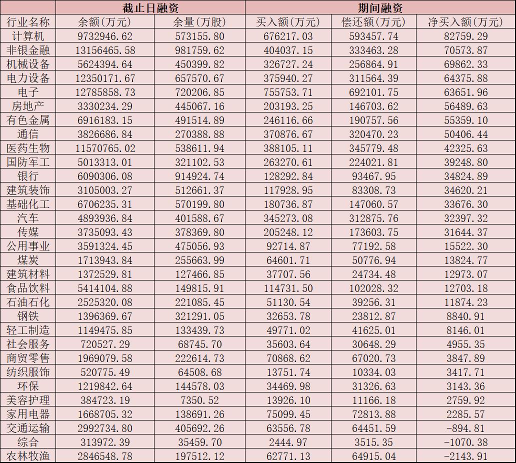 表:9月12日申萬一級行業(yè)兩融交易情況