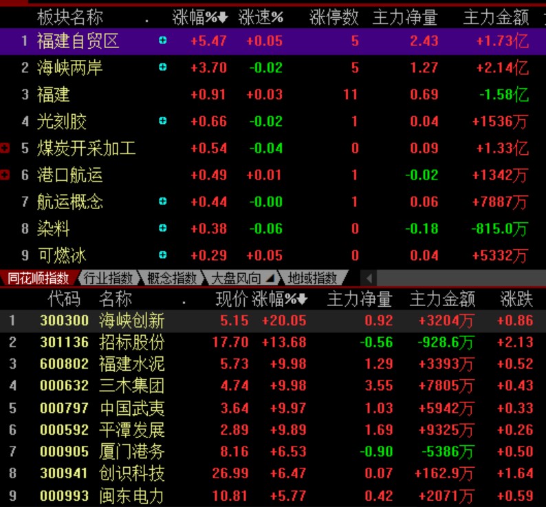 具體看,截至9月13日上午收盤,福建自貿(mào)區(qū)板塊強勢領漲,漲幅高達5.47%,海峽創(chuàng)新、福建水泥、三木集團等多只個股漲停。