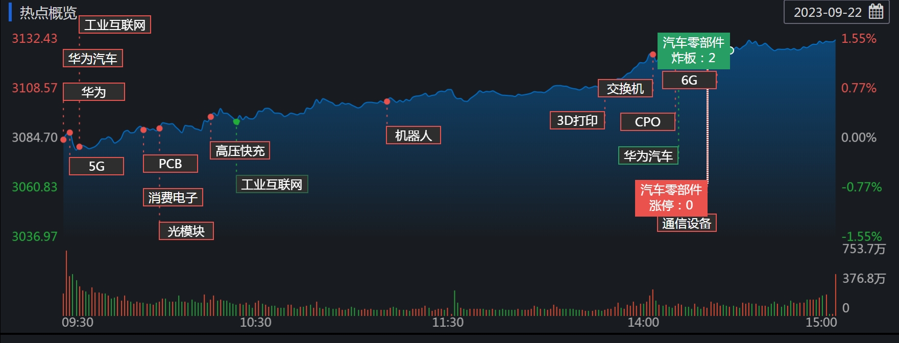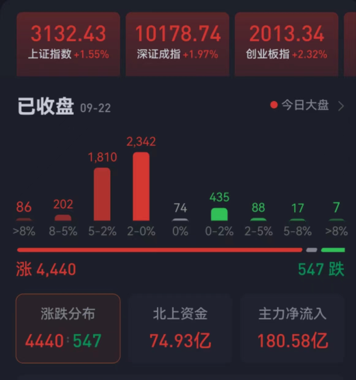 周五(9月22日),A股三大股指震蕩上行,全線飄紅,漲幅均超1%。截至收盤,上證指數(shù)漲1.55%報3132.43點,深證成指漲1.97%報10178.74點,創(chuàng)業(yè)板指漲2.32%報2013.34點,兩市合計成交金額達(dá)7654.59億元,較前一交易日有所放大,北向資金凈買入額74.93億元??傮w上看,兩市個股漲多跌少,超4400只個股實現(xiàn)上漲,形成普漲格局。其中,漲停個股達(dá)35只,跌停個股達(dá)13只。