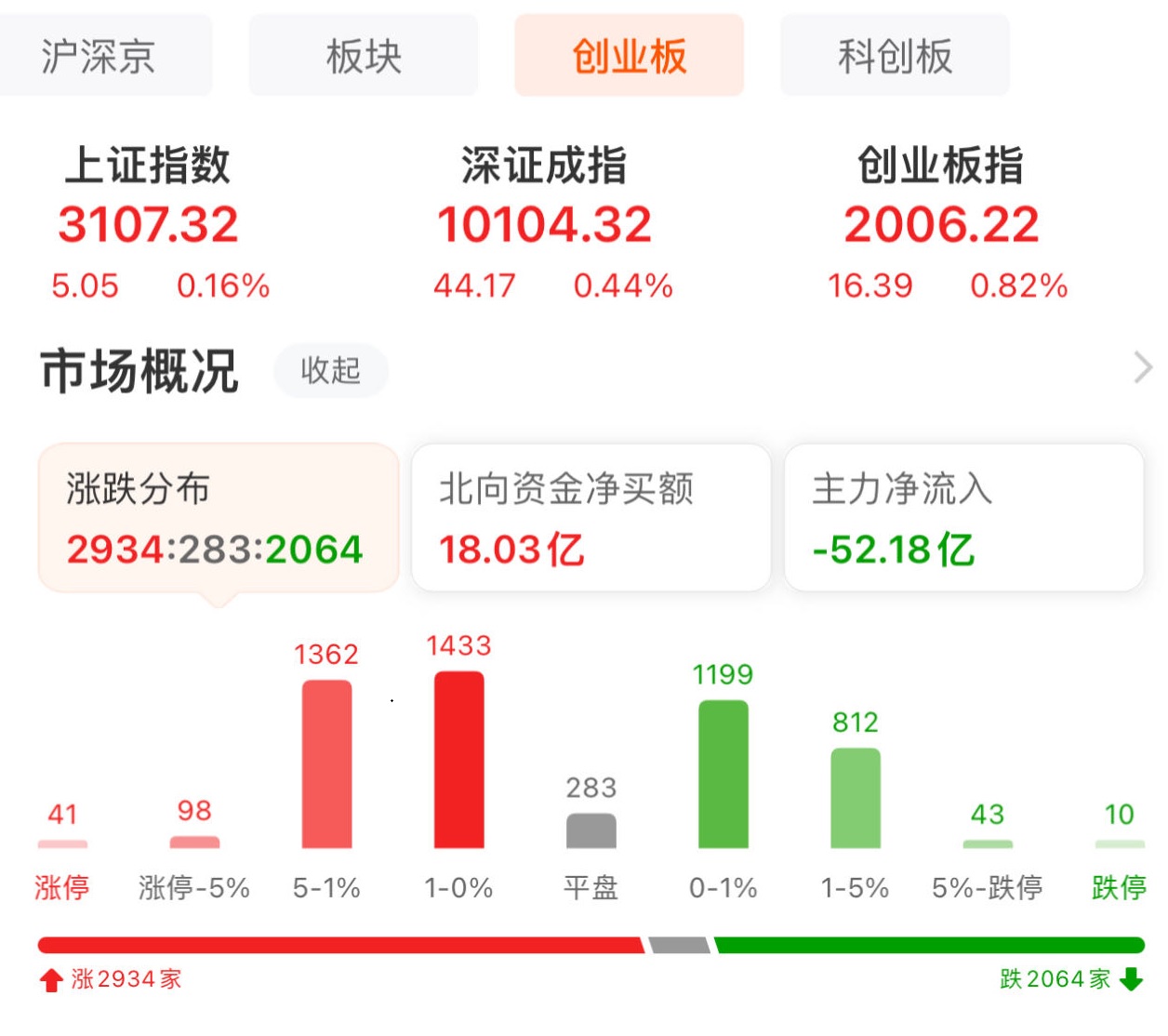 周三(9月27日),A股三大股指集體收漲。截至收盤,上證指數(shù)漲0.16%報(bào)3107.32點(diǎn),深證成指漲0.44%報(bào)10104.32點(diǎn),創(chuàng)業(yè)板指漲0.82%報(bào)2006.22點(diǎn);滬深兩市合計(jì)成交金額7165.34億元??傮w上看,A股個股漲多跌少。從漲跌停情況看,漲停個股41只,跌停個股10只。