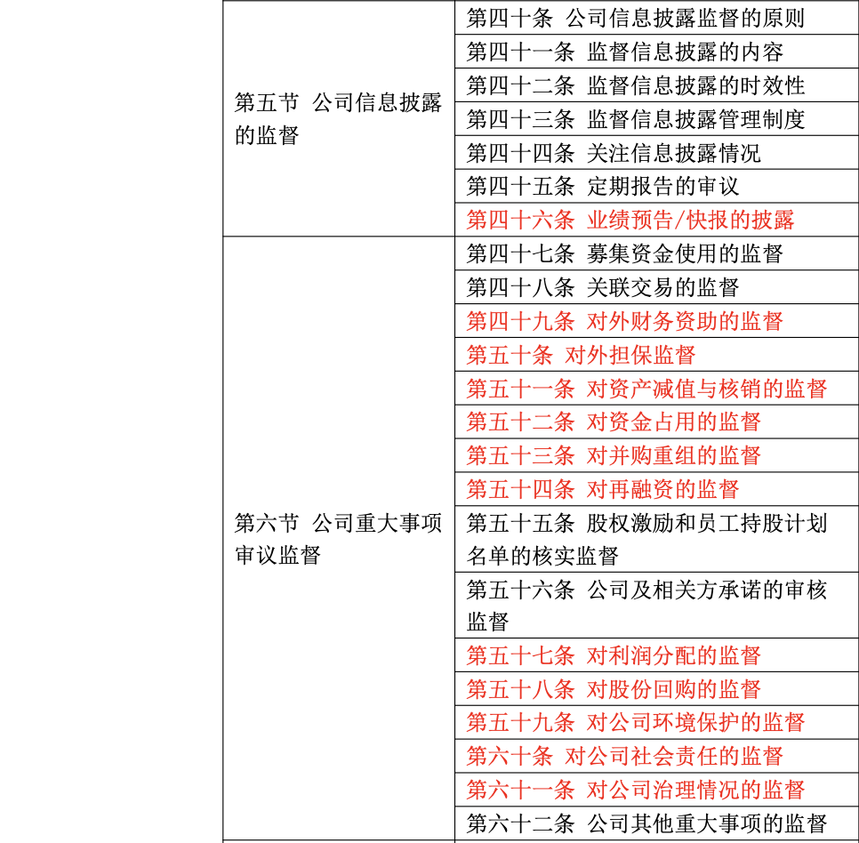 在增加監(jiān)管關(guān)注要點(diǎn)方面,根據(jù)近年來監(jiān)管關(guān)注要點(diǎn),《指引》增加相應(yīng)條目,如對(duì)財(cái)務(wù)會(huì)計(jì)報(bào)告的監(jiān)督;業(yè)績(jī)預(yù)告/快報(bào)的披露監(jiān)督;對(duì)外財(cái)務(wù)資助、對(duì)外擔(dān)保、資產(chǎn)減值與核銷、資金占用、并購(gòu)重組、再融資、利潤(rùn)分配、股份回購(gòu)、公司環(huán)境保護(hù)、公司社會(huì)責(zé)任和公司治理情況的監(jiān)督等。