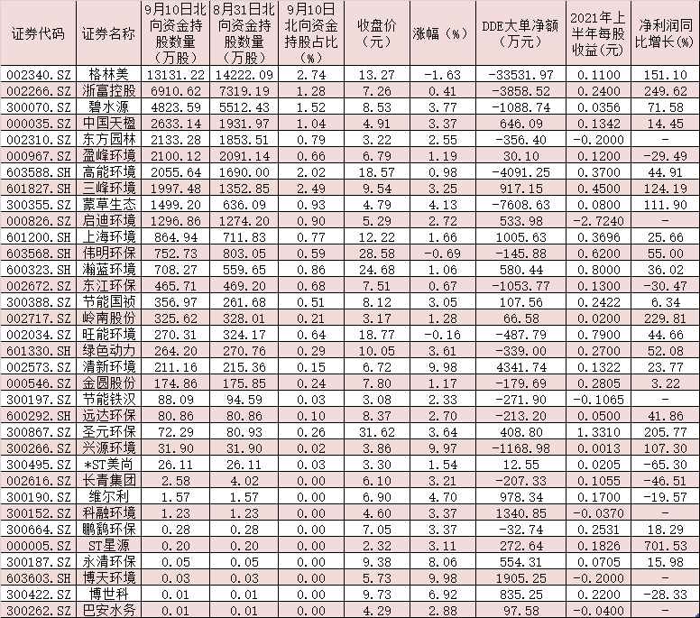 表:9月份以來獲北向資金持有的生態(tài)環(huán)境概念股一覽