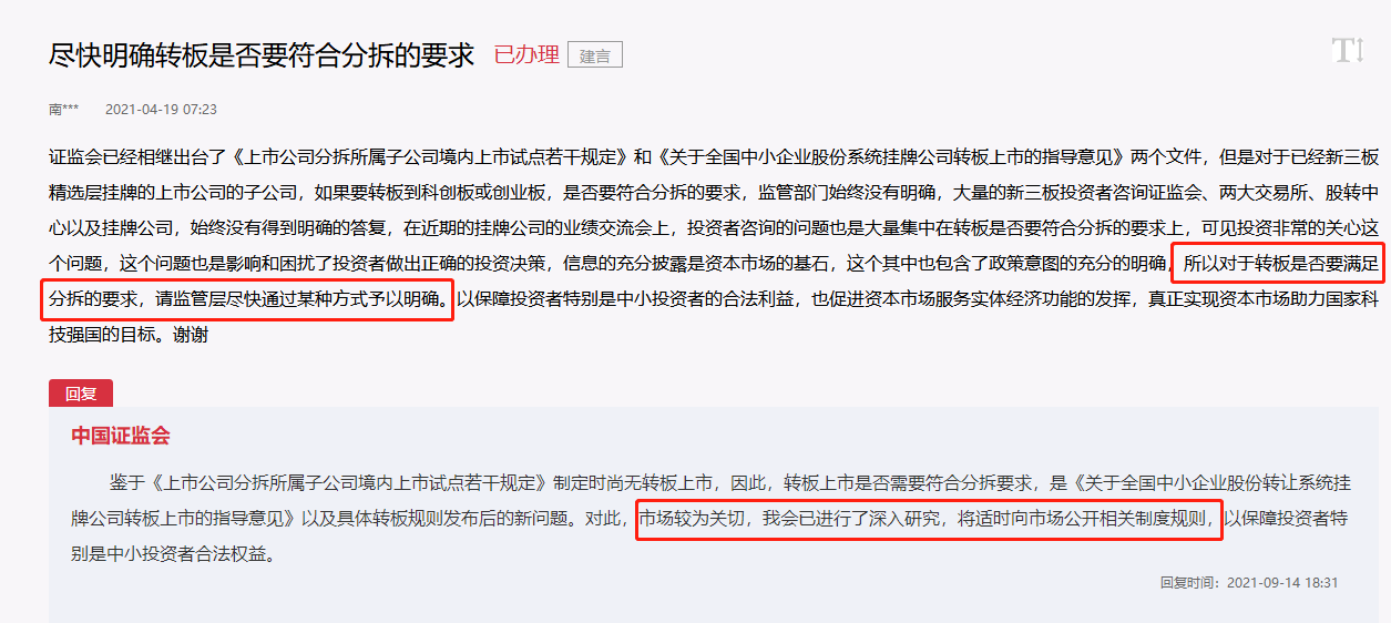 對于轉(zhuǎn)板上市是否需要符合分拆要求,證監(jiān)會已進(jìn)行了深入研究,將適時向市場公開相關(guān)制度規(guī)則,以保障投資者特別是中小投資者合法權(quán)益。