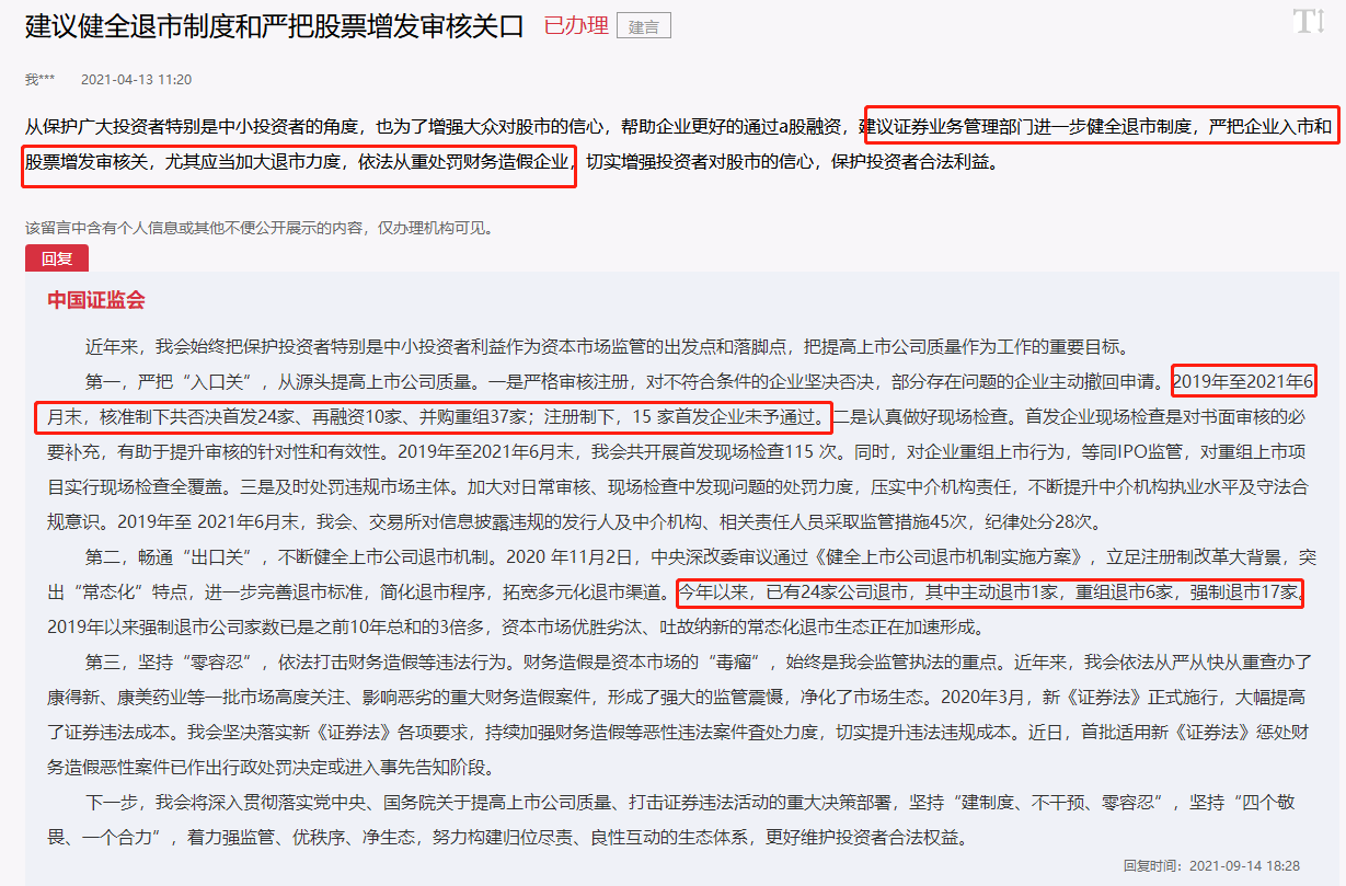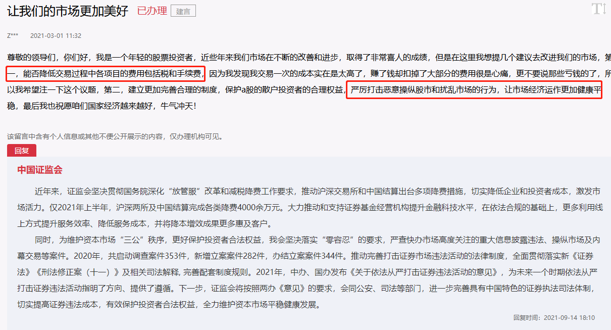 9月14日,在人民網(wǎng)的“領(lǐng)導(dǎo)留言板”上,證監(jiān)會回復(fù)了網(wǎng)友關(guān)注的六個熱點(diǎn)問題,加強(qiáng)券商研報管理、明確精選層轉(zhuǎn)板上市是否要符合分拆要求、能否降低交易過程中各項目的費(fèi)用包括稅和手續(xù)費(fèi)、嚴(yán)厲打擊惡意操縱股市和擾亂市場的行為、健全退市制度、嚴(yán)把股票增發(fā)審核關(guān)口和成立類銀聯(lián)證券聯(lián)合系統(tǒng)等。