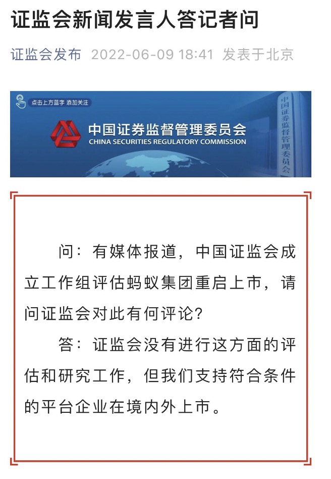 本報訊 近日,有媒體報道,中國證監(jiān)會成立工作組評估螞蟻集團重啟上市。對此,6月9日,證監(jiān)會新聞發(fā)言人答記者問時表示,證監(jiān)會沒有進行這方面的評估和研究工作,但我們支持符合條件的平臺企業(yè)在境內(nèi)外上市。(吳曉璐)