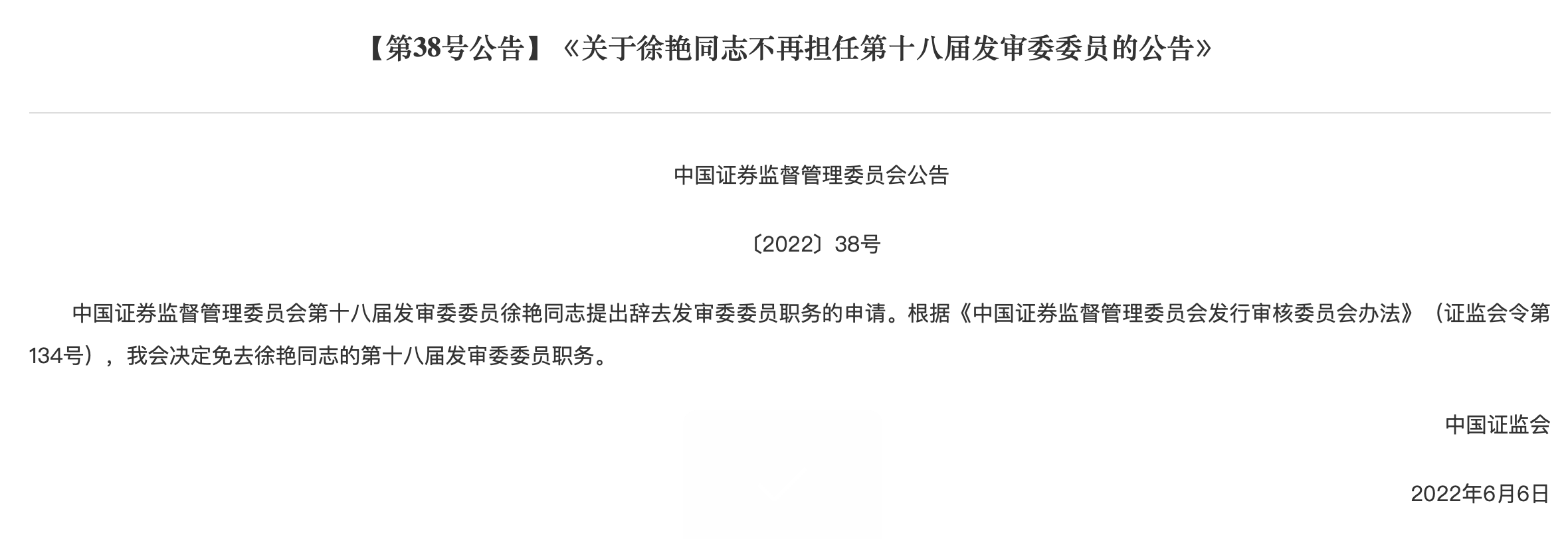 6月24日,中國證監(jiān)會公告顯示,第十八屆發(fā)審委委員徐艷提出辭去發(fā)審委委員職務(wù)的申請,證監(jiān)會根據(jù)發(fā)行審核委員會辦法的規(guī)定,免去其發(fā)審委委員職務(wù)。