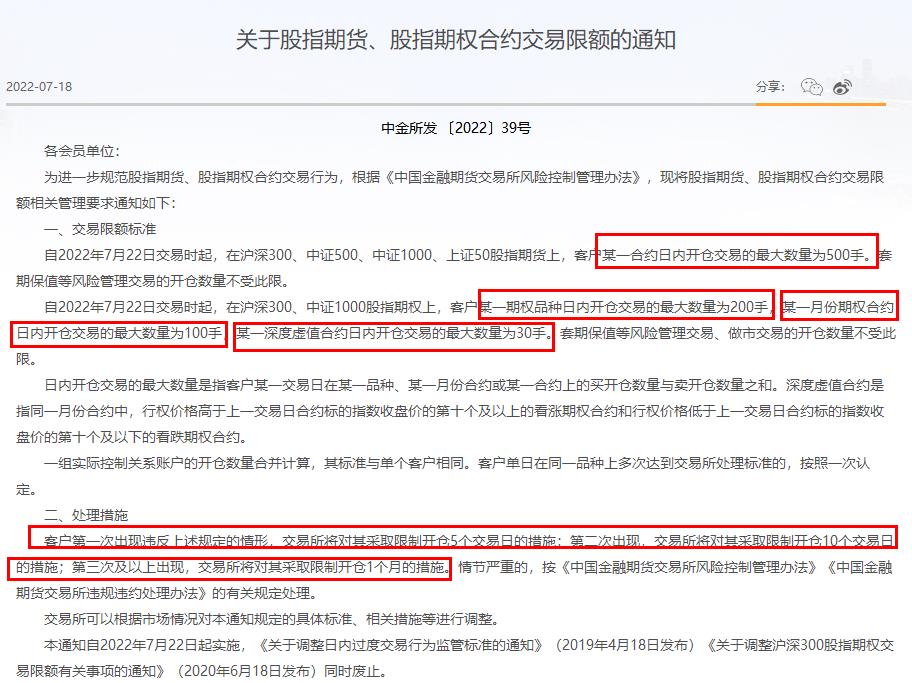 另外,中金所當日發(fā)布的《關于股指期貨、股指期權合約交易限額的通知》顯示,
