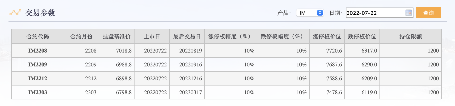 7月21日,中金所發(fā)布《關(guān)于中證1000股指期貨和股指期權(quán)首批上市合約掛盤基準(zhǔn)價的通知》。7月22日,中證1000股指期貨IM2208合約、IM2209合約、IM2212合約和IM2303合約上市,掛盤基準(zhǔn)價分別為7018.8點(diǎn)、6988.8點(diǎn)、6898.8點(diǎn)和6798.8點(diǎn)。