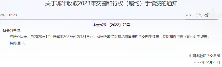 此外,中金所也發(fā)布相關(guān)手續(xù)費(fèi)減免通知,決定減半收取2023年交割和行權(quán)(履約)手續(xù)費(fèi)。