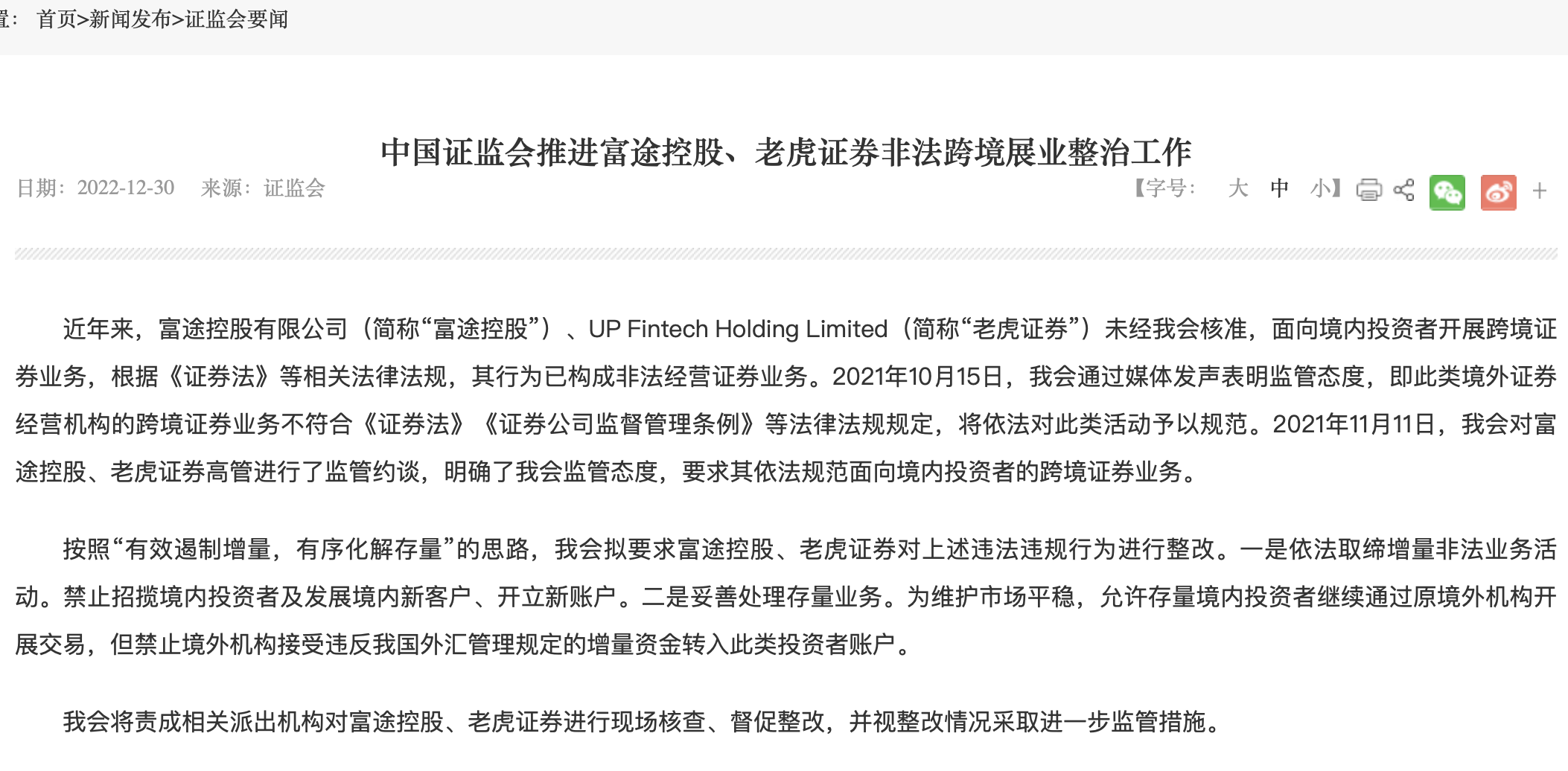 中國(guó)證監(jiān)會(huì)推進(jìn)富途控股、老虎證券非法跨境展業(yè)整治工作2022-12-30 19:04