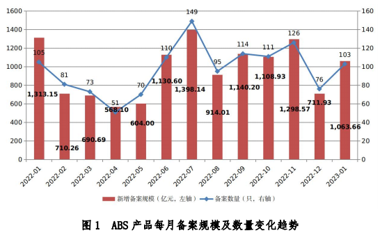 2月22日,中基協(xié)發(fā)布2023年1月份《企業(yè)資產證券化業(yè)務備案運行情況簡報》顯示,2023年1月份,企業(yè)資產證券化產品共備案確認103只,新增備案規(guī)模合計1063.66億元。1月份新增備案規(guī)模環(huán)比增長49.41%,同比減少19.00%。