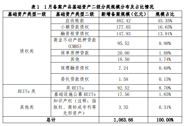 按基礎資產一級分類,1月份債權類產品新增備案規(guī)模950.24億元;REITs類產品新增備案規(guī)模110.08億元;其他類產品新增備案規(guī)模3.35億元。按基礎資產二級分類,小額貸款債權、應收賬款、融資租賃債權、商業(yè)不動產抵押貸款(CMBS)新增備案規(guī)模合計占月度備案產品新增備案規(guī)模的84.89%,較上月增長18.17%。