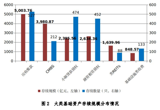 截至2023年1月底,存續(xù)企業(yè)資產證券化產品2206只,存續(xù)規(guī)模19540.34億元,存續(xù)規(guī)模較上月增長0.31%。按基礎資產二級分類來看,應收賬款、商業(yè)不動產抵押貸款(CMBS)、小額貸款債權、融資租賃債權、類REITs以及基礎設施類收費存續(xù)規(guī)模合計16503.08億元,占總存續(xù)規(guī)模的84.46%?;A設施公募REITs、保障房、購房尾款等其他類別基礎資產存續(xù)規(guī)模合計3037.26億元,占總存續(xù)規(guī)模的15.54%。