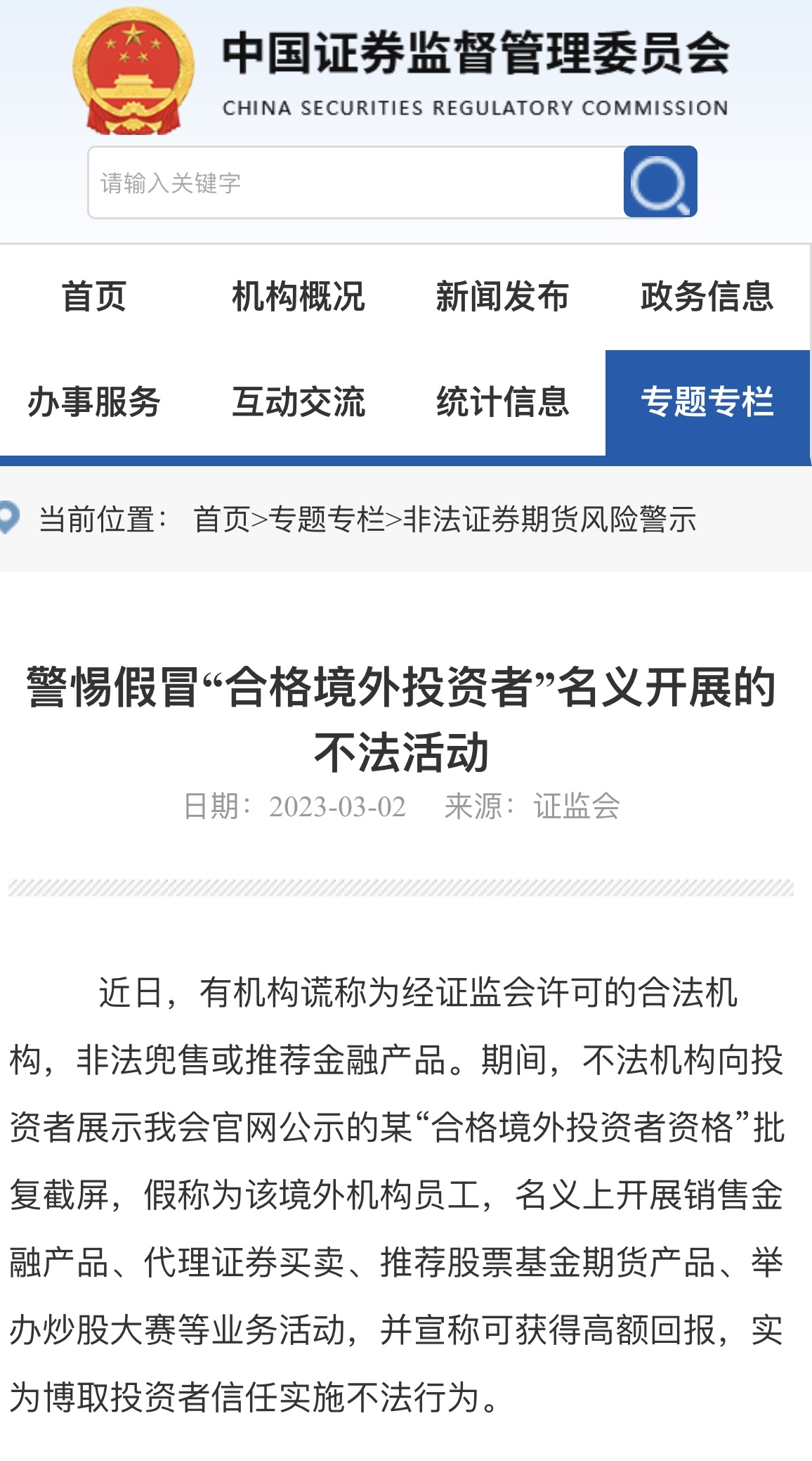 據(jù)證監(jiān)會(huì)網(wǎng)站3月2日消息,近日,有機(jī)構(gòu)謊稱(chēng)為經(jīng)證監(jiān)會(huì)許可的合法機(jī)構(gòu),非法兜售或推薦金融產(chǎn)品。期間,不法機(jī)構(gòu)向投資者展示證監(jiān)會(huì)官網(wǎng)公示的某“合格境外投資者資格”批復(fù)截屏,假稱(chēng)為該境外機(jī)構(gòu)員工,名義上開(kāi)展銷(xiāo)售金融產(chǎn)品、代理證券買(mǎi)賣(mài)、推薦股票基金期貨產(chǎn)品、舉辦炒股大賽等業(yè)務(wù)活動(dòng),并宣稱(chēng)可獲得高額回報(bào),實(shí)為博取投資者信任實(shí)施不法行為。