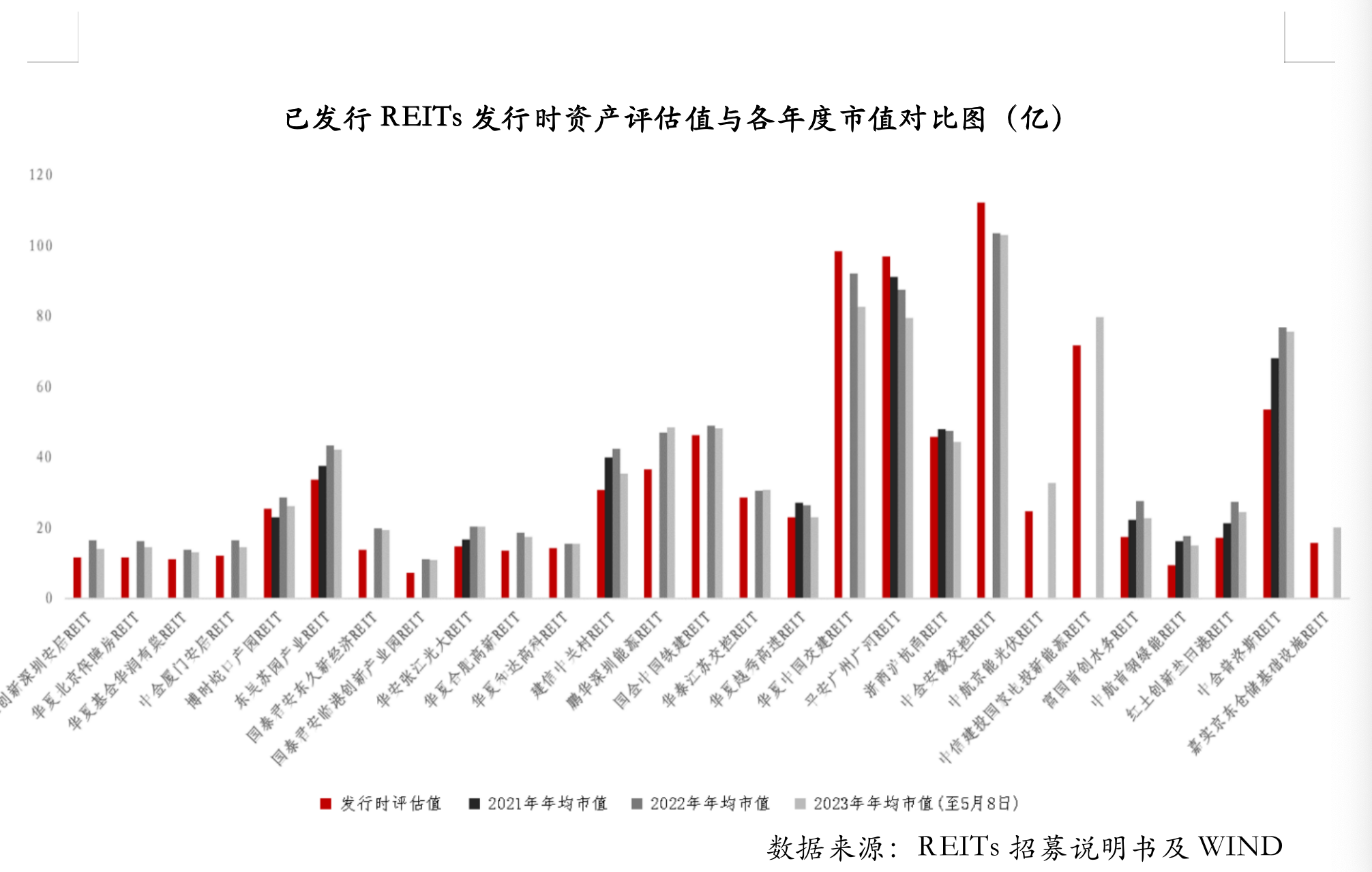 不同于股票,REITs底層的基礎設施資產未來可帶來穩(wěn)定、可預期的收益以及REITs具有強制收益分配的特性,這體現(xiàn)了REITs的本源和特點——長期穩(wěn)定的收益,其更加適合于長期投資和價值投資。盡管資本市場波動風險不可避免,但REITs的底層資產收益和價值的穩(wěn)定性,決定了REITs市值只在一定范圍內波動調整。因此某種意義上,基礎設施的評估價值是REITs投資的壓艙石,其錨定了REITs投資價值。如同價格與價值的關系,價格總是圍繞價值上下波動,而無法脫離其內在價值的影響。如下所示,已發(fā)行REITs發(fā)行時資產評估值與各年度市值對比圖,反映了如上事實。