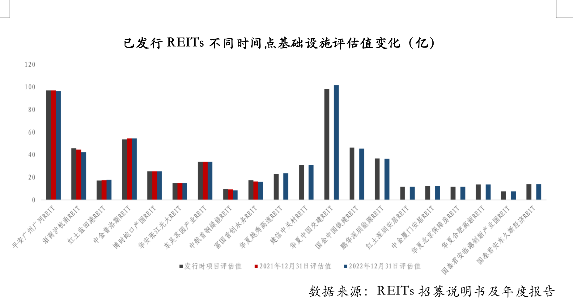 由于基礎設施收益期遞減的特性,短期內雖然價值一般變化較小,但長期來看REITs有著價值遞減的內在因素,但產權類REITs的收益期一般較長且具有一定的增值性,某種程度上可抵消一定的影響。不同資產類型價值評估差異較大,因此REITs投資者應時常關注評估價值的變化,把握投資機遇。如下所示,已發(fā)行REITs短期內基礎設施評估值變化不大。