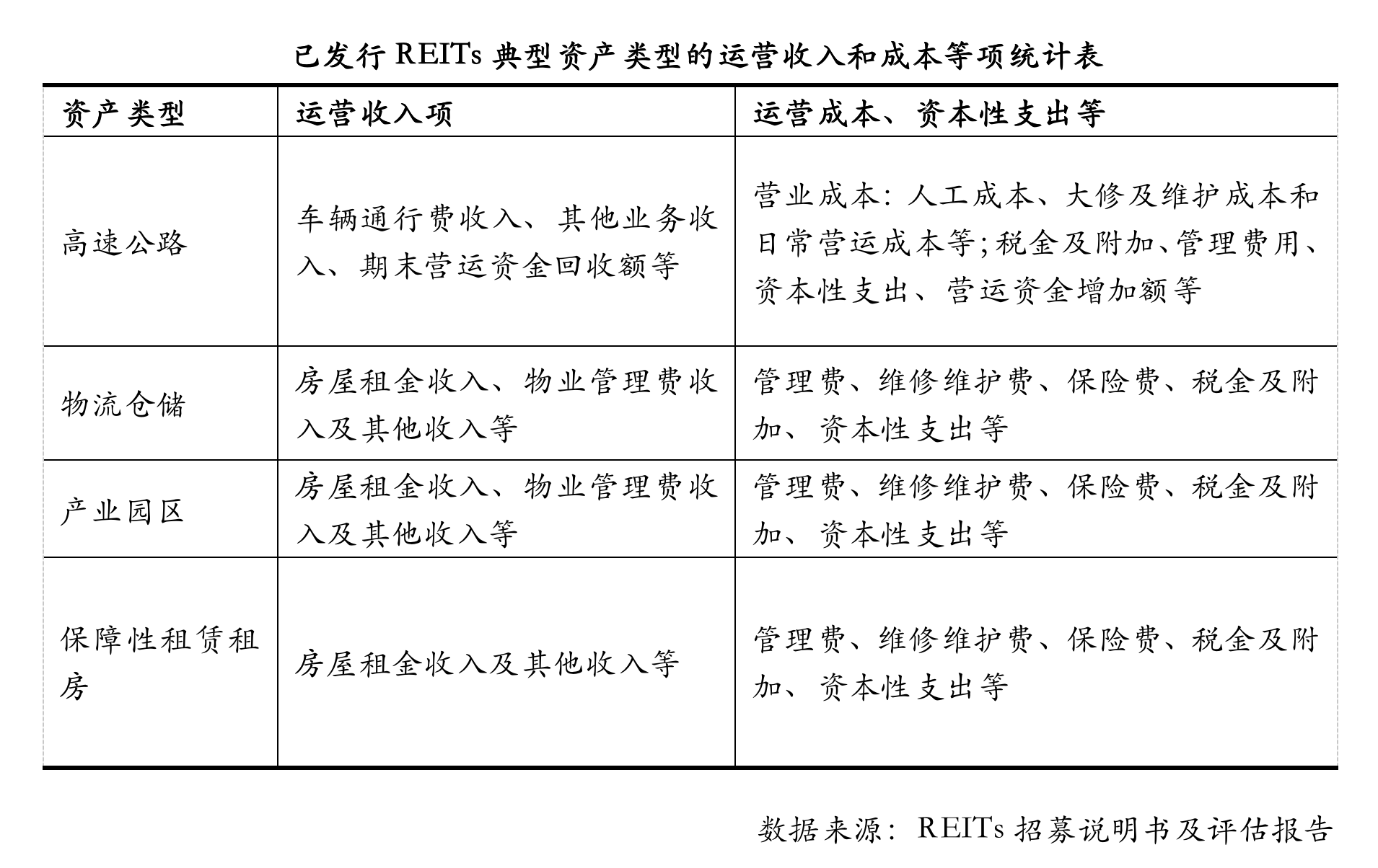 基礎設施資產未來可帶來穩(wěn)定、可預期的收益。未來預期收益是運用收益法評估資產價值的基本參數(shù)之一。其主要通過預測資產未來各期的運營收入和運營成本、資本性支出等進行測算,主要難度在于未來各期收入與支出的變化率的分析和判斷,這需要評估人員具有專業(yè)的分析和技術能力。不同的資產類型預期收益的測算過程差異較大,下面是已發(fā)行REITs的典型資產類型的運營收入項和運營成本、資本性支出項內容: