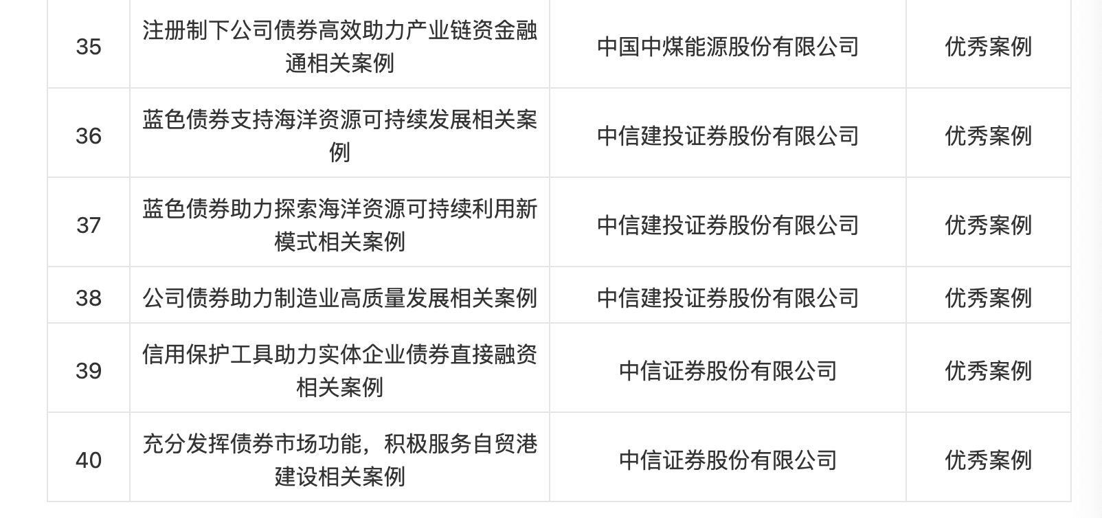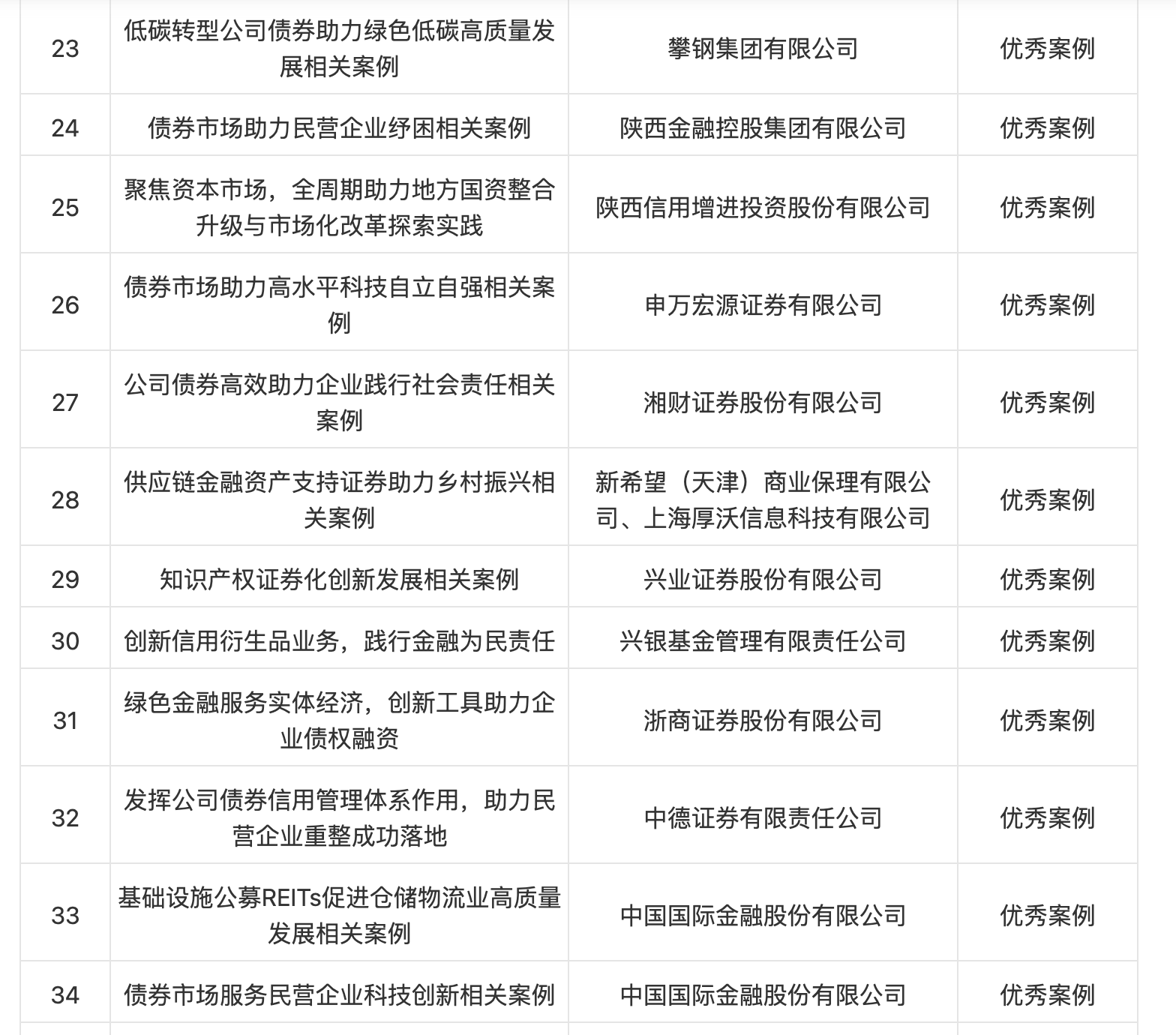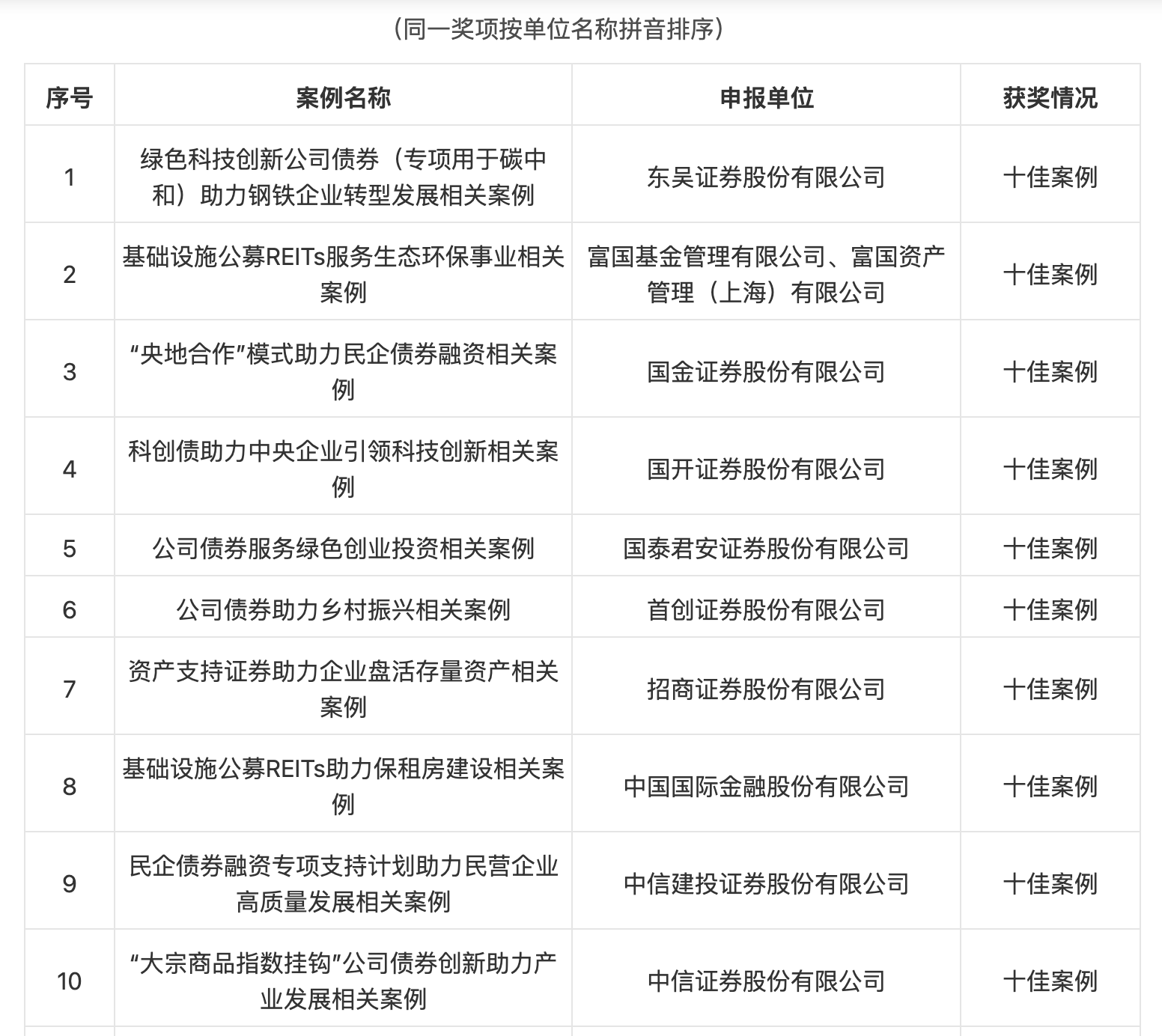 滬深證券交易所組織證券業(yè)協(xié)會(huì)、基金業(yè)協(xié)會(huì)、行業(yè)專家等成立評(píng)審組,經(jīng)過(guò)3輪評(píng)審,擇優(yōu)評(píng)選出一批標(biāo)志性、引領(lǐng)性、示范性、創(chuàng)新性的典型案例,包括10個(gè)“十佳案例”和30個(gè)“優(yōu)秀案例”。