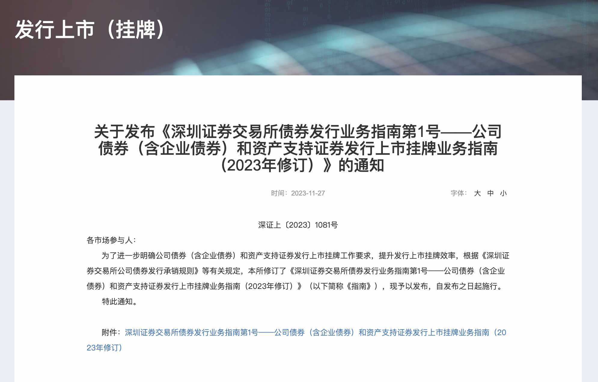 為提升發(fā)行上市掛牌效率 深交所修訂債券發(fā)行業(yè)務(wù)指南2023-11-27 17:41