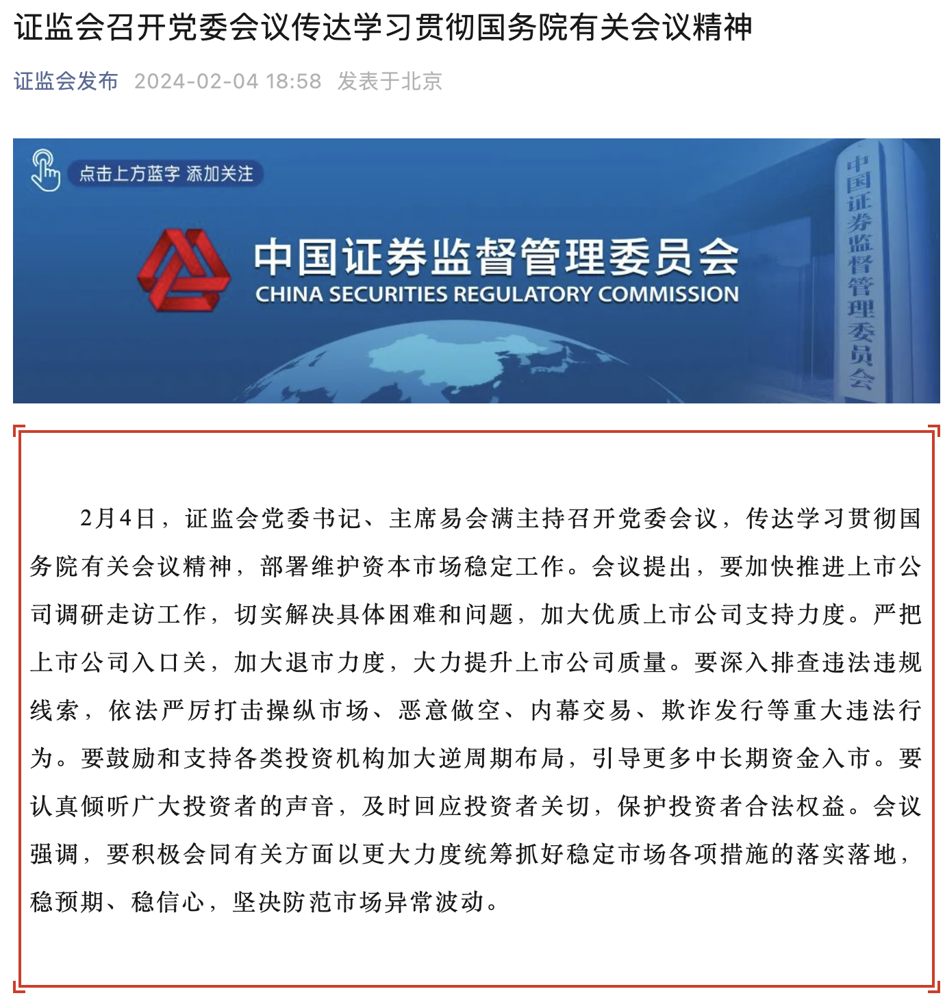據(jù)證監(jiān)會網(wǎng)站消息,2月4日,證監(jiān)會黨委書記、主席易會滿主持召開黨委會議,傳達(dá)學(xué)習(xí)貫徹國務(wù)院有關(guān)會議精神,部署維護(hù)資本市場穩(wěn)定工作。