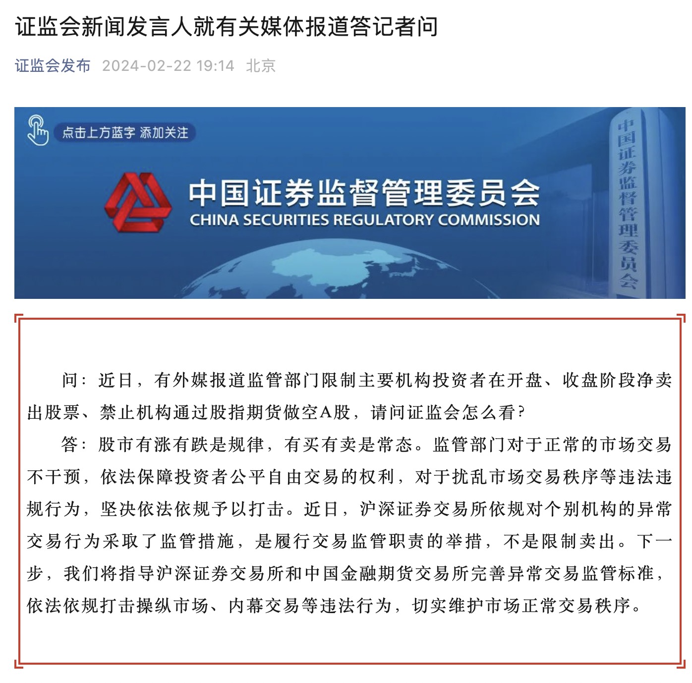 2月22日,證監(jiān)會新聞發(fā)言人答記者問時表示,股市有漲有跌是規(guī)律,有買有賣是常態(tài)。監(jiān)管部門對于正常的市場交易不干預(yù),依法保障投資者公平自由交易的權(quán)利,對于擾亂市場交易秩序等違法違規(guī)行為,堅決依法依規(guī)予以打擊。近日,滬深證券交易所依規(guī)對個別機構(gòu)的異常交易行為采取了監(jiān)管措施,是履行交易監(jiān)管職責的舉措,不是限制賣出。