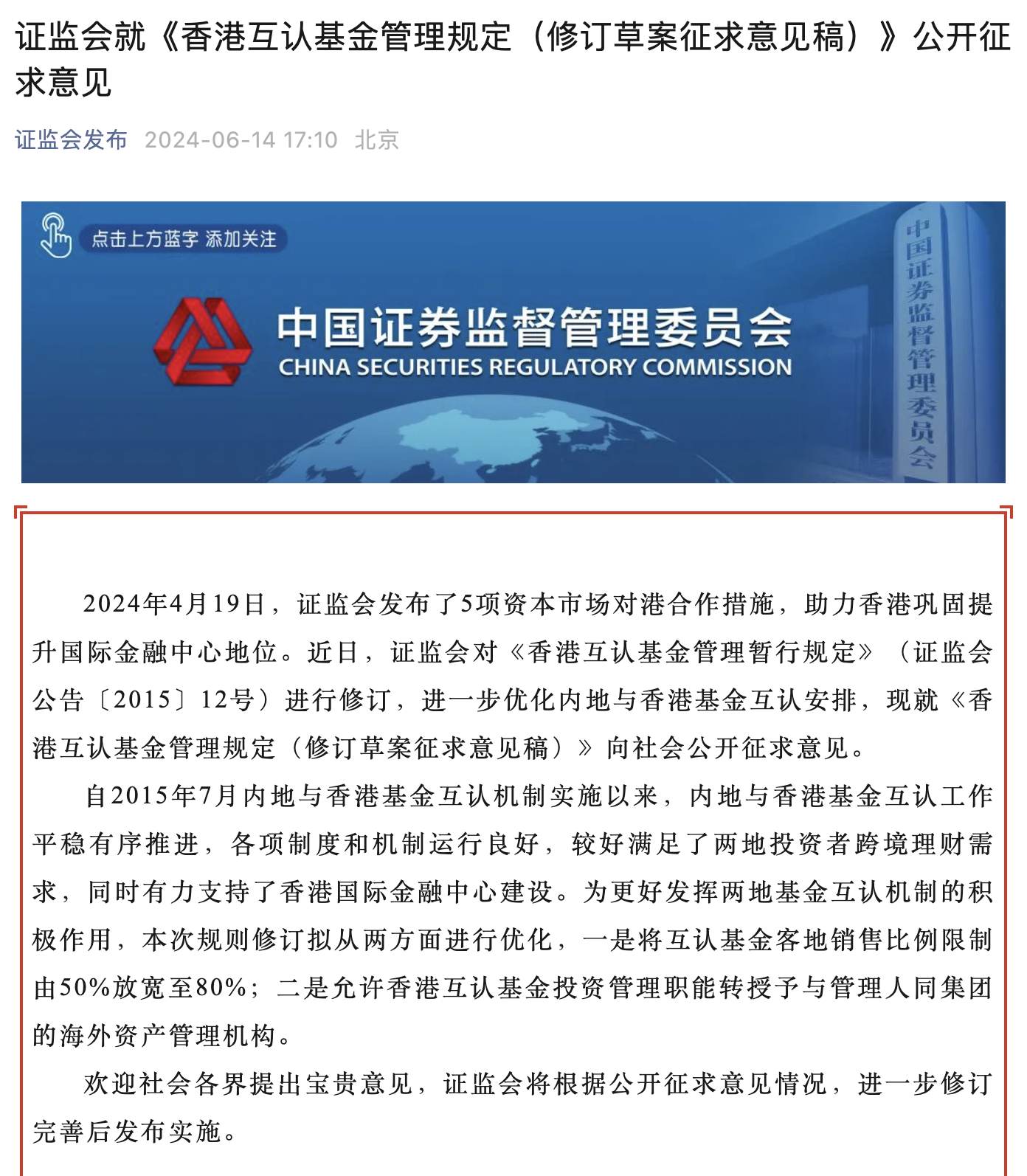 6月14日,中國證監(jiān)會(huì)就《香港互認(rèn)基金管理規(guī)定(修訂草案征求意見稿)》公開征求意見。